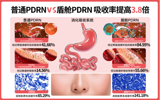 l 隔绝胃肠内的蛋白酶(如胃蛋白酶、胰蛋白酶),保护PDRN的核苷酸链结构完整。实验数据显示,经过胃肠液处理后,盾舱PDRN™的活性留存率达 84.95%,而普通PDRN仅为 41.66%,稳定性提升超2倍。